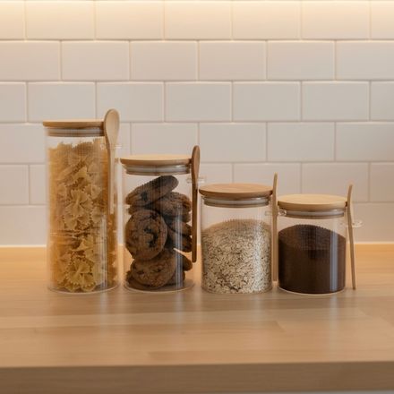 جنس پیرکس شفاف آن، محتویات داخل را بهراحتی نشان میدهد و درب بامبو واشردار از نفوذ رطوبت جلوگیری میکند.