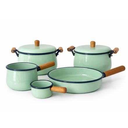 سرویس قابلمه لعابی Donna شامل قابلمه بزرگ و کوچک، ماهیتابه، شیرجوش و سسخوری با لعاب کورهدیده با کیفیت و دستههای چوبی. مناسب پختوپز روزمره و آشپزخانههای شیک